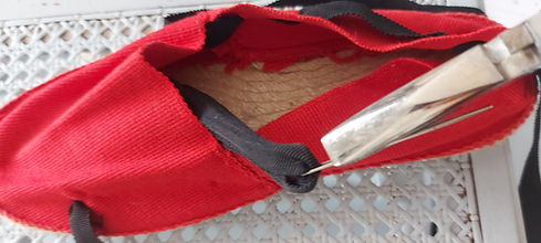 je perce délicatement des trous en m'aidant soit d'un poinçon, soit d'une paire de ciseaux pointus. Je prends soin d'écarter les fils du tissage de l'espadrille, sans les couper.